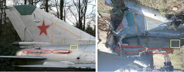 Если развернуть изображение на 180 градусов и сопоставить его с хвостом МиГ-21, мы получим твердое совпадение.
