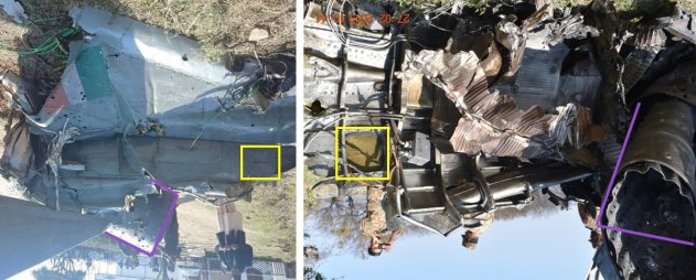 На этом фото- и видеоматериале видно выхлопное сопло, напоминающее двигатель Р-25, которым укомплектована индийская модификация МиГ-21бис (по классификации НАТО «Бизон»). Дополнительные изображения с места событий позволяют нам убедиться, что это хвостовая часть. Например, это изображение: