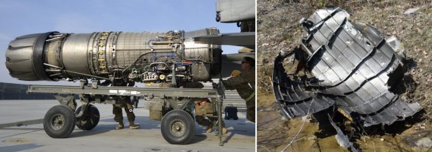 Итак, в совокупности все это говорит нам о том, что утверждение, будто коммутационная коробка — деталь F-16, не соответствует действительности. Куда вероятнее, что это фрагмент индийского МиГ-21. Но как насчет другого фрагмента — той части двигателя, которую также приписывают F-16? На самом деле точного совпадения нет и здесь. Слева двигатель F-16 GE F110 снятый с самолета (фото ВВС США). Справа — фото фрагмента из Пакистана. Обратите внимание на равномерное прямоугольное распределение на крышке двигателя F-16. На фото из Пакистана контуры неровные, имеют разную толщину и к тому же изгибаются внутрь.