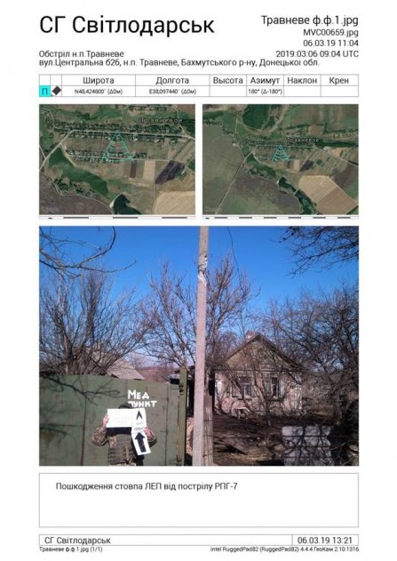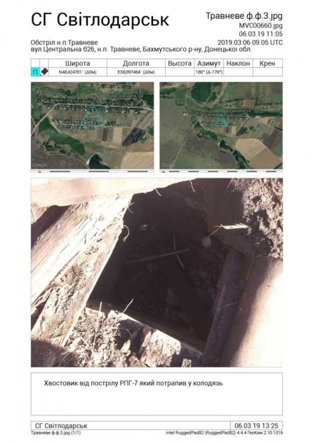 «5 марта в 16.00 вооруженные формирования Российской Федерации обстреляли из ручного противотанкового гранатомета РПГ-7 жилой дом в поселке Травневое, в котором находится пункт гуманитарной помощи населению и медицинский пункт. Представителями украинской стороны СЦКК на месте обстрела обнаружено повреждение столба линии электропередач и разрушенные забор и колодец», — говорится в сообщении.