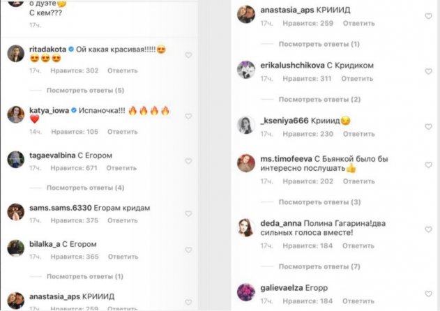 Бывшая возлюбленная Егора Крида, певица Нюша заявила о готовности записать дуэт - об этом стало известно из ее официальной страницы в социальной сети.