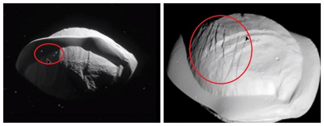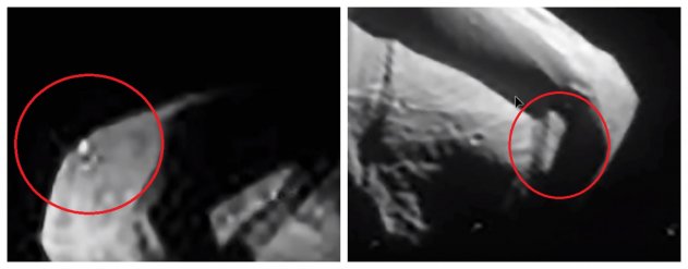 Автору удалось рассмотреть на фотографиях антенны, решётки и даже искусственные модули. Действительно, на спутнике Сатурна можно увидеть ровные выступы и линии, которые в зеркальном порядке дублируются как «на дне», так и «на крыше» предполагаемого аппарата.