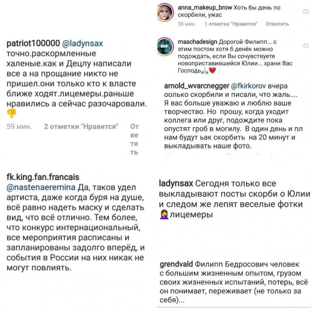 Пользователи считают, что ликуя «на костях Началовой» и посвящая трагедии душещипательные посты, Филипп Бедросович ведет себя лицемерно и недостойно. Подобное отношение задевает чувства поклонников Юлии, ведь по их мнению, коллеги будто демонстрируют, что в смерти певицы нет ничего особенного, а ведь она была любимицей тысяч россиян. Искренне сочувствующие утрате люди не могут скорбеть и ликовать одновременно, заключили фолловеры.