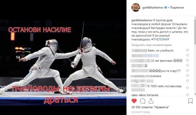 Но то, что его юмор немного «затупился» сегодня отметили пользователи Instagram. На его странице появилось фото двух фехтовальщиков и подпись: «Я против драк пчеловодов в любой форме! Остановим пчеловодный беспредел вместе. До тех пор, пока у них есть доступ к шпагам, это не закончится! Я за мирный пчеловодизм». Некоторых подписчиков данная шутка развесилила: «Да ё мое) смешно читать и смотреть на них сразу)», «ахахах)))Это де действительно очень жестооокооо))», «Смешно)))».