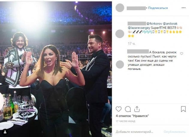 Поклонники обратили внимание, что на столе Ани Лорак, Лазарева и Киркорова слишком много бокалов и рюмок, из-за чего пользователи Сети заподозрили троицу в алкоголизме. «Пьют, как черти!» - написал один из фанатов. Но, естественно, как это часто бывает, пользователи соцсети скорее всего поспешили с выводами, ведь что именно пили звезды из тех бокалов и рюмок определить заочно невозможно. Не исключено, там действительно были спиртные напитки, а, может быть, певцы ограничились вполне безобидными, вроде сока или минеральной воды.