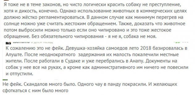 Некоторые рассказали, что видели чау-чау, раскрашенного «под панду» и настоящего львёнка, накачанного транквилизаторами. Неудивительно, что живой «реквизит» служит недолго жестоким владельцам, вынуждая их брать новых питомцев для своего бизнеса. Зоозащитники предлагают принимать меры против мучителей животных. Бывают случаи, сообщают они, когда факт жестокого обращения доказать проблематично. Тогда, можно обратить внимание полиции, что субъект «со зверушкой» занимается незаконной коммерческой деятельностью и, хоть так, найти на него управу. При этом, не следует забывать, что всегда можно позвонить на горячую линию по защите животных и пожаловаться на живодёров в любой части страны.