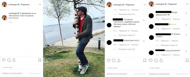 Забавный снимок тут же стал поводом для шуток подписчиков артиста, где уже комментаторы могли проявить свое остроумие. Некоторые даже цитировали стихи, намекая, что Виторган «одурел» без женской ласки, а потому «как жену чужую» обнимает березку. Еще одна категория фанатов видела явную похожесть березы с Собчак, намекая или же прямо говоря, что такая же «доска» или «бревно в постели».