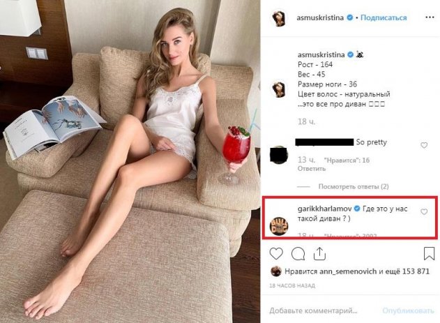 Супруга Гарика Харламова и звезда сериала «Интерны» Кристина Асмус в очередной раз спровоцировала поклонников в соцсети Instagram обсуждать свою личную жизнь. Знаменитость опубликовала пост, где позировала в одной только кружевной пижаме на диване. Фолловеры сразу же принялись обсуждать соблазнительное фото Кристины. Стоит отметить, что в комментариях появился и Гарик Харламов, который на этот раз не промолчал и поинтересовался у жены: «Где это у нас такой диван?». Поклонники сразу же стали предполагать, что «Бульдог», после слухов о любовниках Асмус, стал подозревать её в супружеской неверности.