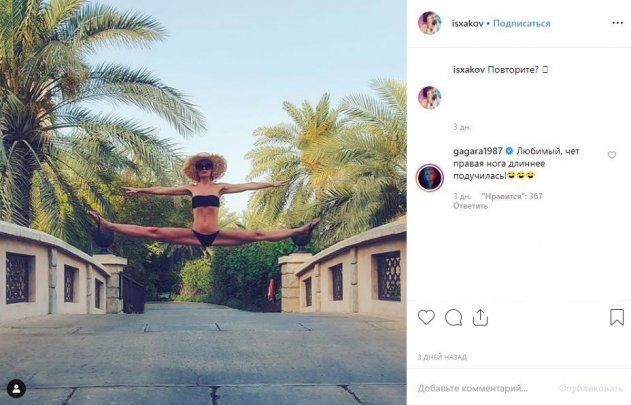 Сначала Исхаков опубликовал фото Полины на фоне некого моста, где она якобы выполняет шпагат в полете. Фото не слишком удачное, ведь выставляет все недостатки стройной фигуры знаменитости, а именно костлявые ноги. Сама Гагарина заметила, что на снимке одна нога получилась длиннее второй, что, скорее всего, говорит о неудачном фотошопе, когда артистку в фоторедакторе «поднимали» в воздух. Неужели профессиональный взгляд фотографа не заметил эту очевидную асимметрию или же заметил, но решил, что так поиздеваться над женой будет весело?