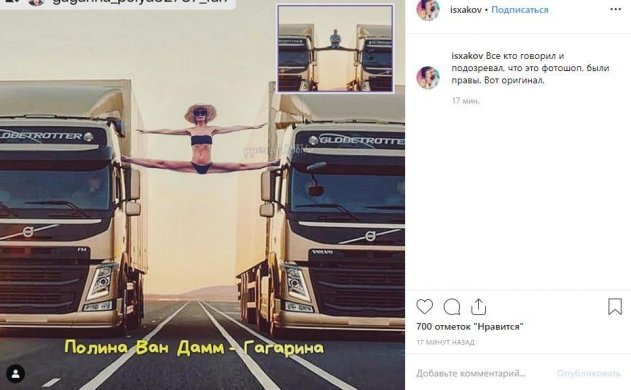 Более того, когда фанаты пытались сделать замечание Дмитрию, мол зачем он так с женой, тот отвечал им очень грубо, пытаясь «доминировать» даже над незнакомыми людьми. Буквально чрез пару дней он выставил еще более, по ее мнению, смешное фото с не менее «смешной» подписью. «Полина Ван Дамм Гагарина», - написано на снимке, где фигуру артистки «переклеили» поверх знаменитого фото Жан Клода Ванн Дамма между грузовиков.