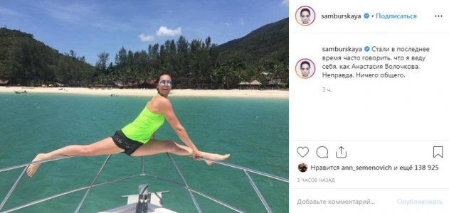 32-летняя российская кинозвезда и телеведущая Настасья Самбурская недавно повторила эффектный шпагат Анастасии Волочковой на яхте и в шутку заявила, что её снимок совсем не похож на подобное фото балерины. Видимо, на зависть Волочковой, актриса решила доказать, что трюки балерины не такие уже и сложные, если она смогла в точности их повторить.