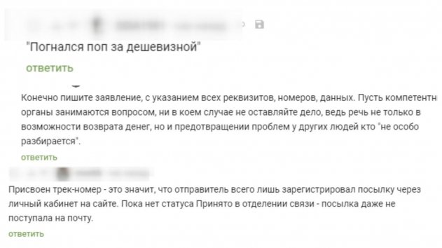 В Сети подняли на смех такого доверчивого покупателя-неудачника и заявили, что цена должна была вызвать у него массу претензий, и вообще, связываться с иногородними продавцами в принципе не желательно. Некоторые предположили, что в доле оказалась «Почта России», но это предположение сразу отмели, но в один голос посоветовали писать заявление со всеми фото переписки, квитанций и прочего. Посоветовали не забыть и трек-номер, дескать не бог весть что, но хоть какая-то идентификация.