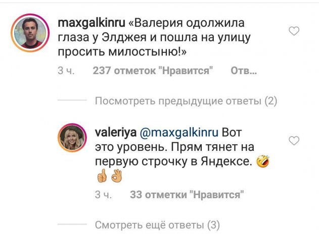 «Валерия одолжила глаза у Элджея и пошла на улицу просить милостыню!» - написал артист, будто намекая на то, что в последнее время она далеко не такая востребованная артистка, как раньше, и ей действительно скоро придется побираться, если падение рейтинга продолжиться. Возможно, Галкин публично подшутил над Валерией только потому, что хотел задеть ее своей ядовитой шуткой, а там можно было сделать безнаказанно. В этом случае, можно только удивиться количеству внутренней агрессии у Галкина, которую он, видимо, не знает куда деть.
