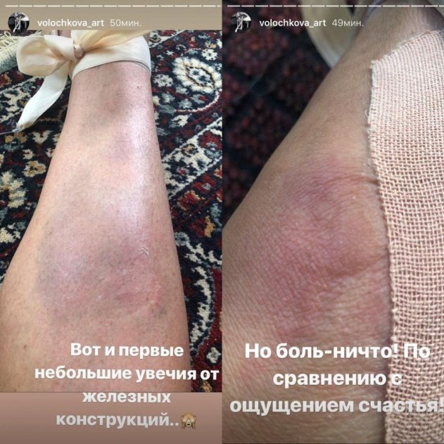 До сих пор она рассказывала лишь о том, как ей нравится репетировать, и до сих пор молчала, какую цену за это платит. Сегодня для Instagram Stories она сделала несколько фото, на которых показала полученные травмы. «Вот и первые небольшие увечья от железных конструкций. Но боль - ничто! По сравнению с ощущением счастья!» - написала Волочкова.