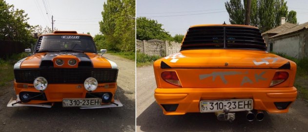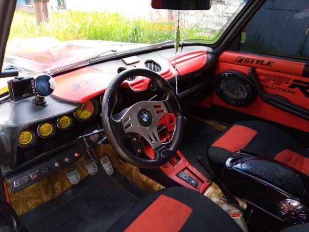 Более того, на машину установили новую выхлопную систему, задние фонари необычной формы, а сам кузов окрашен в ярко-оранжевый цвет. Но самое интересное находится внутри – ВАЗ-2107 получил руль от BMW, а также новую переднюю панель и приборку.