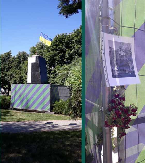 К ограде прицеплена распечатка с изображением памятника и цветы. Наверху — флаг Украины.