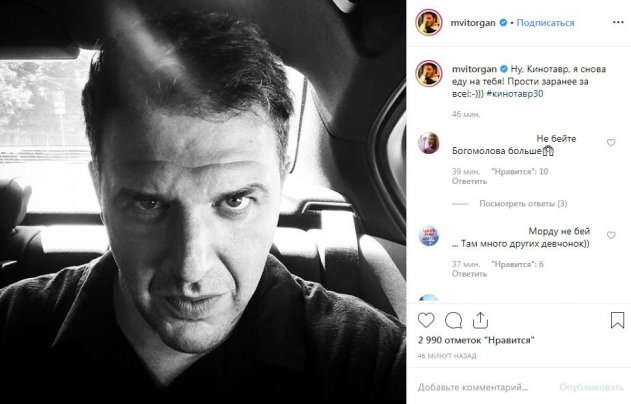 Известный российский актер Максим Виторган отправился на «Кинотавр». Об этом намерении он заявил у себя на странице в Instagram, добавив к сообщению свое фото с угрожающим выражением лица. Актер откровенно намекнул на вероятность «активного» продолжения его конфликта с режиссером Константином Богомоловым, который также находится на мероприятии.