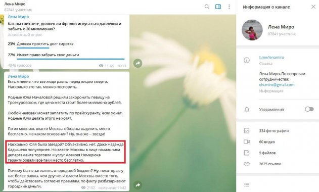 Такое решение порадовало родственников, коллег и поклонников покойной артистки, но только не известного блогера Лену Миро, которая в Telegram раскритиковала родных знаменитости, а также унизила и саму Юлию. По мнению Миро, Началова - не звезда и её популярнее «даже Надежда Кадышева».