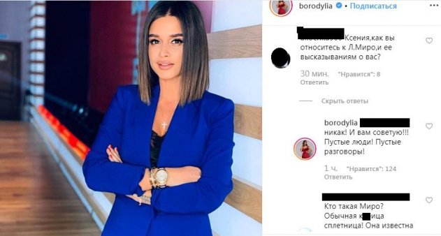 «Никак не отношусь! И вам советую!!! Пустые люди! Пустые разговоры!» – прокомментировала Бородина. Многие подписчики не остались в стороне и продолжили обсуждение этой темы. По их словам, скандал Миро с Бородиной может перейти все границы, ведь во много журналистка себя не контролирует. Например, она оскорбляет честь и достоинство людей, что запрещено законом.