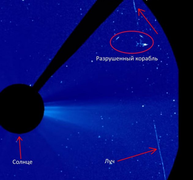 С тех пор, как продвинутые оптические приборы появились в свободной продаже, тысячи энтузиастов по всему миру принялись вглядываться в глубины космоса, пытаясь отыскать признаки внеземной жизни. Недавно одному из уфологов удалось наткнуться на явные доказательства, подтверждающие, что «земные» пришельцы начали войну с аннунаками с таинственной планеты Нибиру, о которой уже не раз упоминалось в материалах информационного агентства «ВладТайм». Вооружившись мощным телескопом, астроном заметил массивный луч, который разрушил рядом с Солнцем объект громадных размеров. По всей видимости, обитатели Нибиру послали на Землю корабль с захватнической армией, а некие инопланетные существа, обороняющие территорию Солнечной системы, уничтожили космический челнок, разрушив его на мелкие части с помощью некой лазерной установки. На фото, предоставленном уфологом, отчётливо видно, что ярчайший луч пронзил некий объект, развалившийся на части прямо в открытом космосе, о чём свидетельствуют множественные обломки.