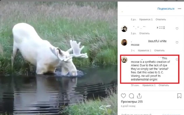 «Этот лось - синтетическое творение пришельцев! Из-за нехватки красителей они просто освободили «животное». Передайте это видео С. С. Уорингу. Он докажет его внеземное происхождение!»
