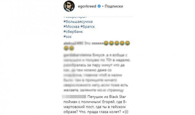 Так же могло случиться и в этот раз. «Петушок из Black Star пойман с поличным!», - пишет комментатор, намекая на то, что безобидный свой пост Егорка удалил без следа. Значит, что-то из написанного его могло задеть за живое. Или просто – Тимати настоял, т.к. явленный образ не соответствует имиджу «гангстерского» лейбла», а «косяки» за Егоркой уже были.