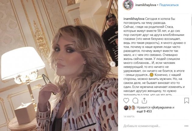 Михайлова призывает жен всеми силами стремиться сохранить свой брак, по крайней мере, не препятствовать общению неверного мужа с общими детьми. Также звездная жена призналась, что надеется на долгую и счастливую совместную жизнь со своим знаменитым мужчиной.