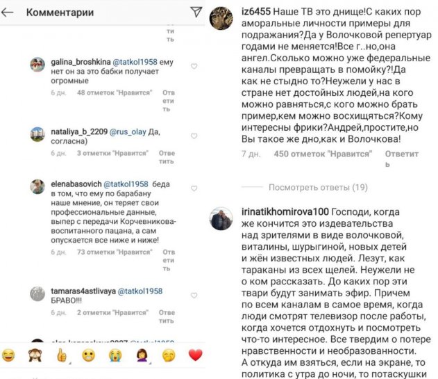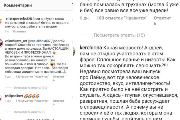 «Стыдно за вас, Андрей!», «Малахов теряет свои профессиональные навыки, скоро без работы останется», «Если он будет такой же затычкой в каждой бочке, то недолго ему осталось работать на втором», - пишут пользователи комментариях на странице Андрея.