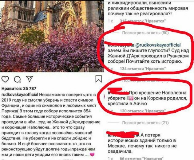 Недавно пользователи сети пристыдили Рудковскую за незнание истории. Яна Рудковская выставила у себя на странице в Instagram пост посвященный пожару в Нотр-Дам-де-Пари. В самом начале поста, продюсер сокрушается от этой страшной трагедии, после чего приводит исторические факты для осознания масштаба бедствия: «Самые большие исторические события проходили в нём: суд на Жанной д’Арк, крещение и коронация Наполеона. Это то что сразу приходит в голову когда осознаёшь масштаб бедствия. Не уберегли и не спасли, обидно и больно. И ещё больнее осознавать то, что на реконструкцию уйдут долгие годы, прежде чем мы, и наши дети увидим его вновь таким...»,- написала Рудковская.