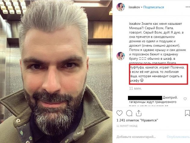 Несмотря на сказочный мир, в котором якобы живет пара, в их семье все равно может происходить что-то неладное. Недавно Дмитрий выставил в сеть пост и рассказал о веселых играх с дочерью. По его словам, «НуфНуфа, кажется, играет Полечка, а если её нет дома, то любимая тёща, которая ненавидит сидеть в шкафу». Вроде бы, ничего странного, обычные детские игры, в которых принимает участие вся семья. Но невольно возникает вопрос: Почему теща находится дома в то время, когда нет Полины? Не исключено, что мать Гагариной следит за Исхаковым в отсутствие дочери.