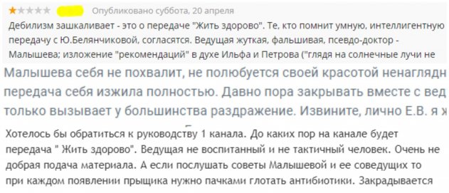 Поэтому, объединившись против Малышевой, общество требует «Первый канал» уволить ее, так как кроме недоумения и раздражения она не вызывает больше никаких чувств.