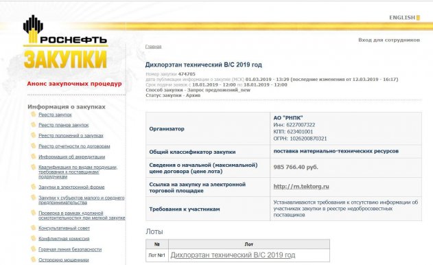 Изучение сайта закупок «Роснефти» показало, что в начале 2019 года компания для неизвестных нужд приобретала большое количество технического дихлорэтана. Именно его наличие привело к крупнейшему в этом году позору российской нефтедобывающей промышленности.