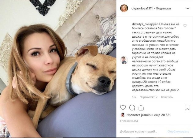 В одном из своих постов в социальной сети телеведущая отметила, что сама иногда побаивается одного из псов и, скорее всего, неспроста, ведь он может отражать поведение Ольги дома. Если Дина (так зовут агрессивную собаку) «может оторвать голову», то её хозяйка, возможно, предпочитает «идти по головам».
