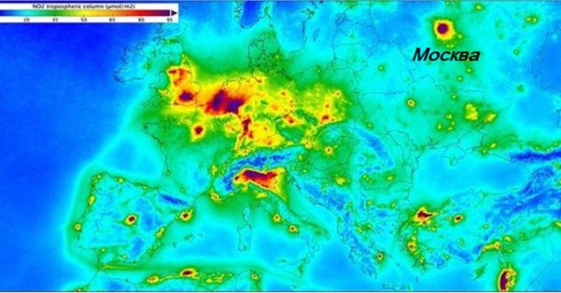 Огромное ядовитое пятно диоксида азота, из-за которого глобальное потепление погубит города, угрожающе нависло над Европой и Москвой.