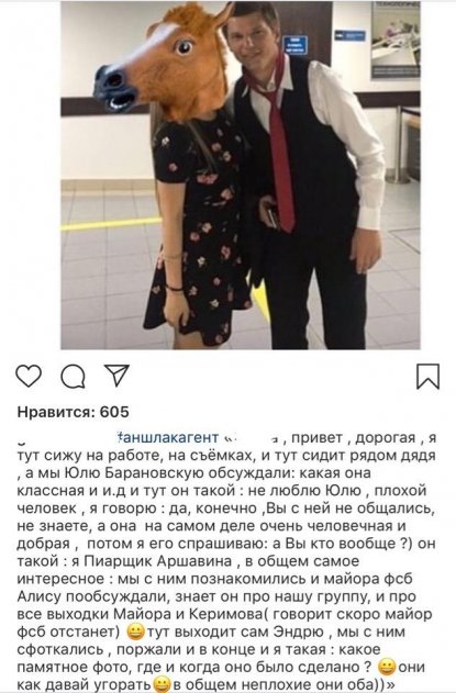 «Сижу на работе, на съемках, а тут рядом сидит дядя, а мы Юлю Барановскую обсуждали, какая она классная и т. д. И тут он сказал, что не любит Юлю, плохой она человек. Я сказала, что она очень человечная и добрая, а вы с ней не общались и откуда можете знать? Он ответил, что он пиарщик Аршавина. Мы с ним пообсуждали Алису Аршавину экс-супругу футболиста. Тут вышел сам Андрей мы с ним сфотографировались, посмеялись, в общем, неплохие они оба», - сообщают подписчики в Instagram группе gavrilovnak1.