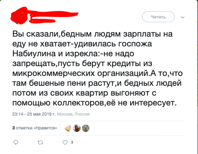А взбеситься были причины. Согласно недавнего проса, почти 1/4 россиян экономит на еде - это значит, что им не хватает зарплат на нормальное пропитание, не говоря уже о путешествиях, развлечениях или просто сбережениях. Из-за этого многие прибегают к займам в микро финансовых организациях (МФО), что ещё больше усугубляет ситуацию. Пользователи сети отмечают: «Людей из квартир выгоняют!», - говоря о последствиях займов, которые Набиуллина поощряет.