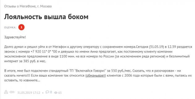 О подобном случае накануне поведала сеть. Житель Москвы на портале Banki.ru рассказал о том, как «Мегафон» сперва отговорил его от ухода к другому оператору, но затем обманул с тарифом. «Лояльность вышла боком», - жалуется доверчивый абонент.