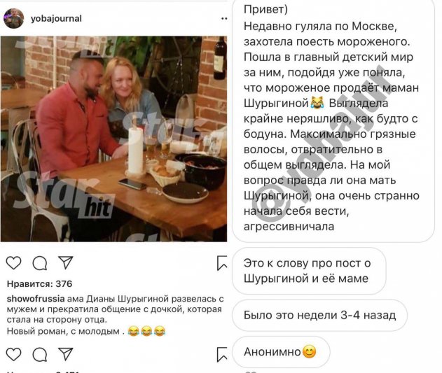 «Недавно гуляла по Москве, захотела поесть мороженного. Пошла в главный детский мир за ним, подойдя уже поняла, что мороженое продает маман Шурыгиной. Выглядела крайне неряшливо, как будто с бодуна. Максимально грязные волосы, отвратительно вообщем выглядела. На мой вопрос, правда ли она мать Шурыгиной, она очень странно начала себя вести, агрессивничала», - рассказал подписчик телеграм-канала YOBAJUR.