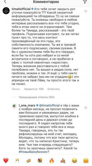 После такого заявления Тимати не смог удержаться и напомнил Левану, что контракт с такими условиями, действовавший на протяжении 7 лет, подписывал никто иной, как сам Леван. С юридической точки зрения получается, что все его претензии о том, что он теперь не владеет ни своим псевдонимом, ни своими песнями, только упущение исполнителя, который некогда соглашался на такие условия лейбла.