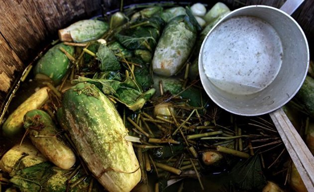 Для рассола положите в кастрюлю оставшийся острый перец, чеснок и хрен. Добавьте семена фенхеля, кориандр, укроп, петрушку и черный перец для аромата. Налейте дистиллированную воду и посолите. Доведите до кипения, затем выключите огонь и оставьте настаиваться. Как только настой остынет до комнатной температуры, вылейте его на огурцы. Убедитесь, что все ингредиенты рассола попали в банку. Сверху положите оставшиеся листья. Убедитесь, что огурцы полностью погружены в рассол. Вы можете использовать вес, чтобы они не всплывали — стеклянный рамекин (небольшая миска для приготовления блюд — прим. перев.) сделает свое дело. Плотно закройте банку и оставьте для брожения вдали от прямых солнечных лучей при комнатной температуре в течение четырех-десяти дней. Вы узнаете, что огурцы готовы, когда рассол начнет темнеть. Как только вы довольны степенью брожения, перенесите банку в холодильник. Огурцы будут храниться в холоде несколько месяцев.