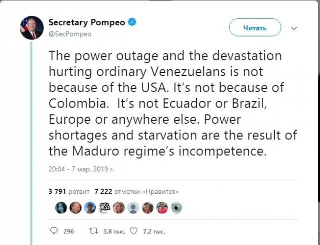 «Отключение электричества и разрушения, причиняющие вред обычным венесуэльцам, происходят не из-за США. Не из-за Колумбии. Не из-за Эквадора или Бразилии, Европы или кого-либо ещё. Дефицит электроэнергии и голод являются результатом некомпетентности режима Мадуро».