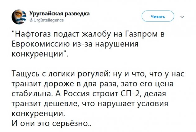 Нам с вами не понять, почему транзит газа через Украину являлся «сдерживающим фактором против российской агрессии», а транзит газа по «Северному потоку — 2» в Европу станет «политическим оружием России против Европы». Подобная противоречивая логика доступна только украинцам.