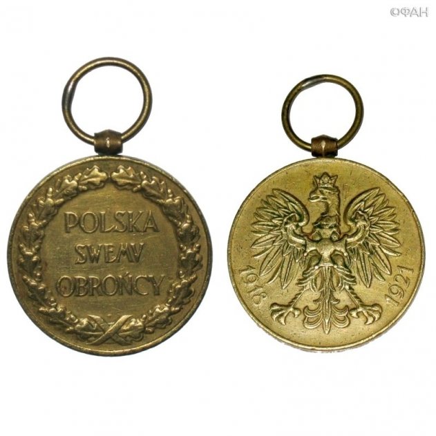 Перед вами любопытная медаль. Надпись на ней гласит: «Польша — своему защитнику», на обратной стороне даты: 1918–1921 гг.