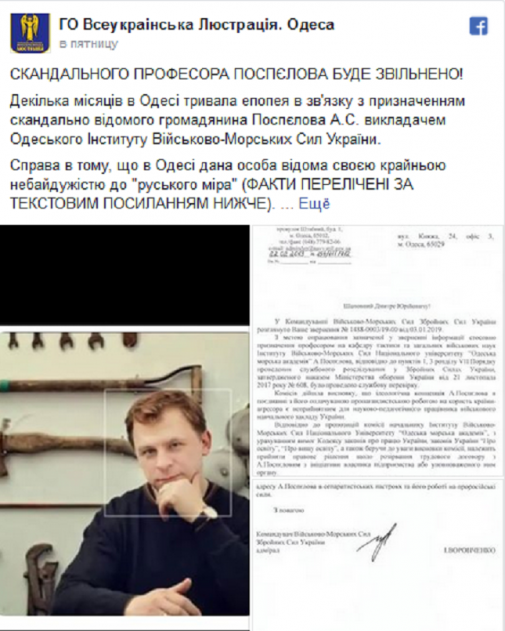 Националисты ОО «Всеукраінська Люстрація», несколько месяцев ведущие травлю профессора Андрея Сергеевича Поспелова, добились его увольнения из Института Военно-Морских Сил Украины.