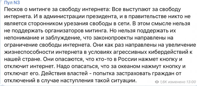 Четвёртый законопроект, направленный против «всемирной кампании по распространению дезинформации, организованной Россией» — из той же серии. Точной цифры, во сколько обойдётся сие удовольствие, пока нет. Но уже известно, что почти $10 млрд. будет выделено на операции киберкомандования США. Кстати, здесь стоит сделать шаг в сторону и передать привет всем противникам создания суверенного интерната и привести комментарий пресс-секретаря президента РФ Пескова.
