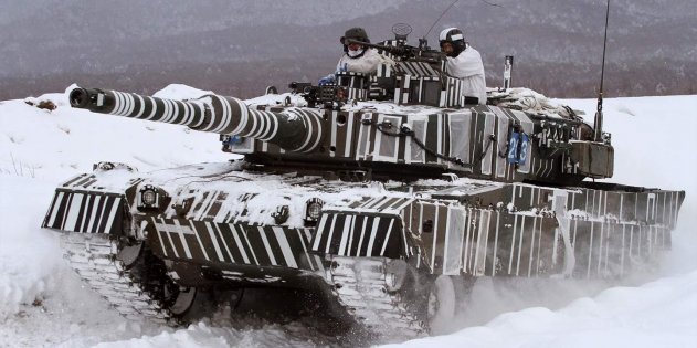 Дело не только в скорости. Красить танк в зимний цвет ради учений не совсем рационально. Ведь скоро его предстоит перекрашивать обратно — и всё на народные денежки! Проще нанести мелом или краской через трафарет зимний скрывающий рисунок. Как, например, совсем не бедные японцы на своих Тип 90.