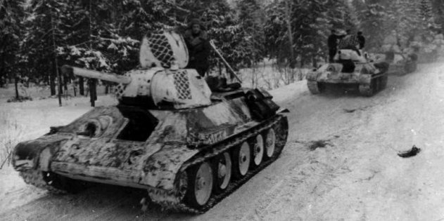 Колонна танков Т-34 1-й гвардейской бригады Финские танкисты окрасили трофейный советский Т-50 в похожую схему. Белое покрытие было разорвано зелёными неровными полосами, которые при случае могли сымитировать хвою карельских лесов.