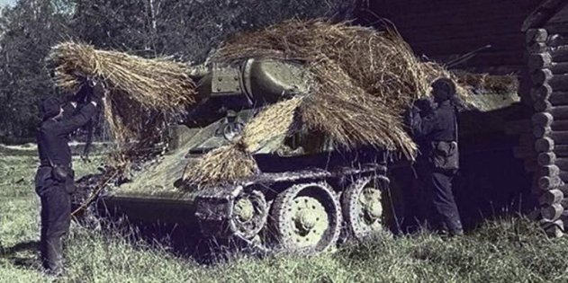 Однако в годы Второй мировой не всегда успевали красить танки в камуфляж. Зачастую боевые машины шли в бой в стандартном зелёном или сером цвете.