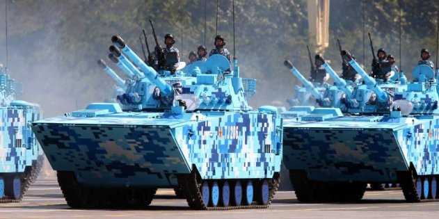 В сине-голубом варианте для китайской морпехов такой камуфляж привлекает большое внимание на земле, но на море должен смазывать силуэт плавающих танков и БМП.