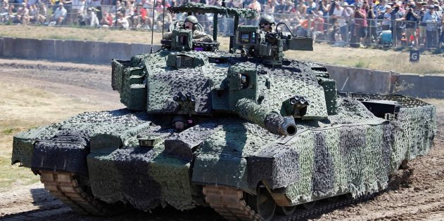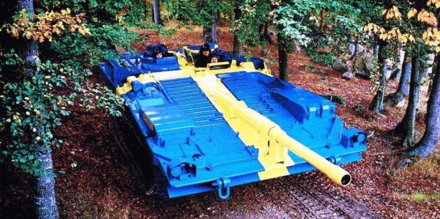 Этот шведский strv 103 демонстрирует на себе цвета национального флага. Так часто раскрашивают боевые машины для парадов, презентаций, танковых биатлонов и других увеселительных мероприятий. Ещё один вид покраса предназначен для того, чтобы танк видели издалека — это белый цвет техники «голубых касок» ООН.